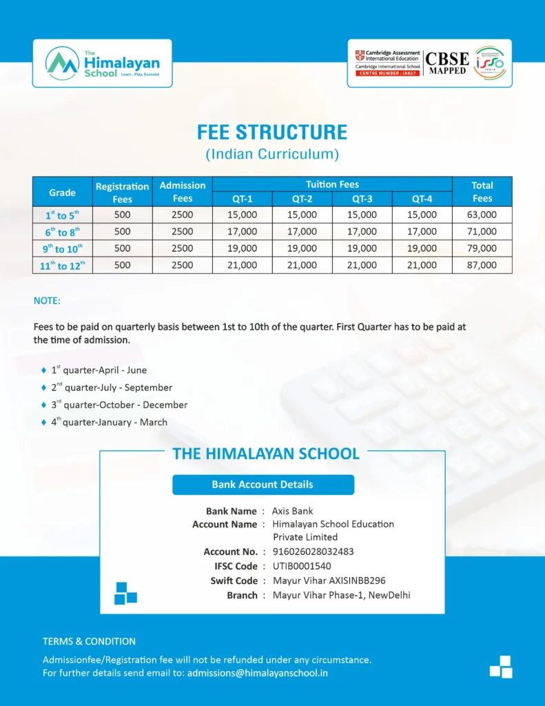 Fees A 21st-century world class education doesn’t have to come with a high price tag. We believethat children should have access to high-quality, well-rounded education for a moderate fee irrespective of the course they choose. Indian Curriculum Fee Cambridge Curriculum Fee